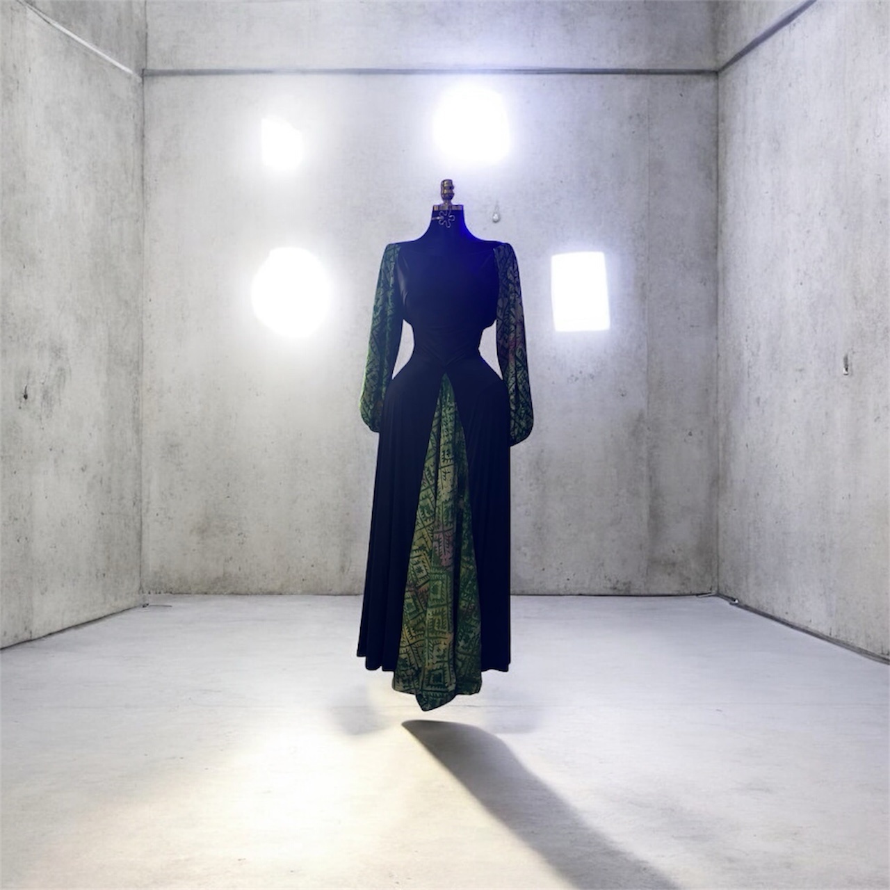 • Panneau Central en Adirè : Le cœur de la robe présente un insert en soie Adiré authentique, teint à la main avec des motifs organiques dans des tons de vert émeraude et de jaune citron.