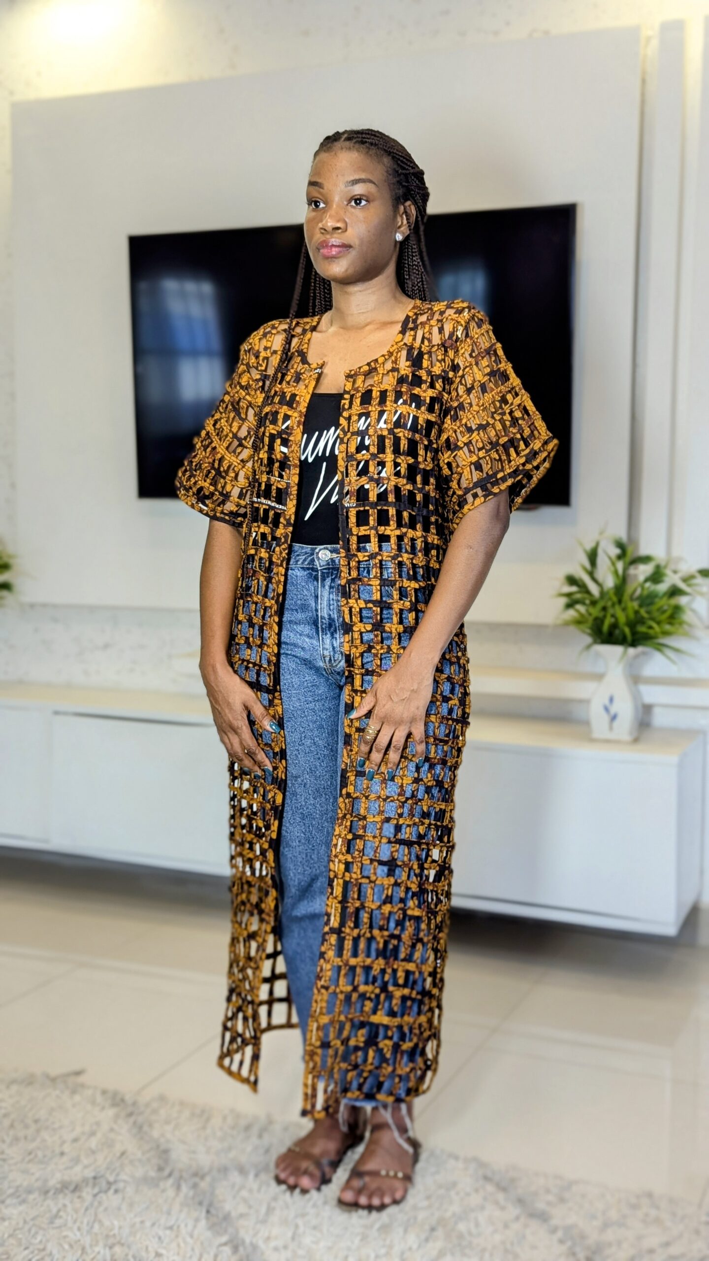 Ce kimono long en pagne Wax est la pièce forte qu’il te faut pour rehausser instantanément n’importe quelle tenue. Avec sa longueur d’environ 1m35, il allonge la silhouette et offre un tombé fluide et majestueux. Un véritable bijou textile à porter au quotidien ou lors de grandes occasions.