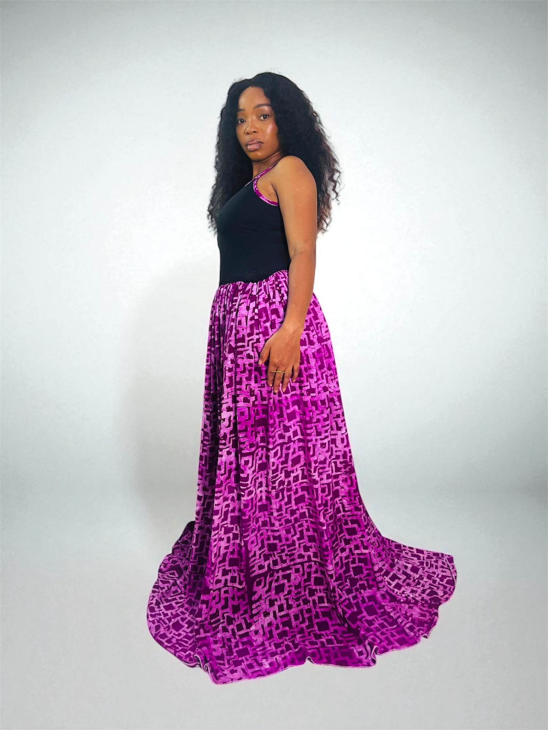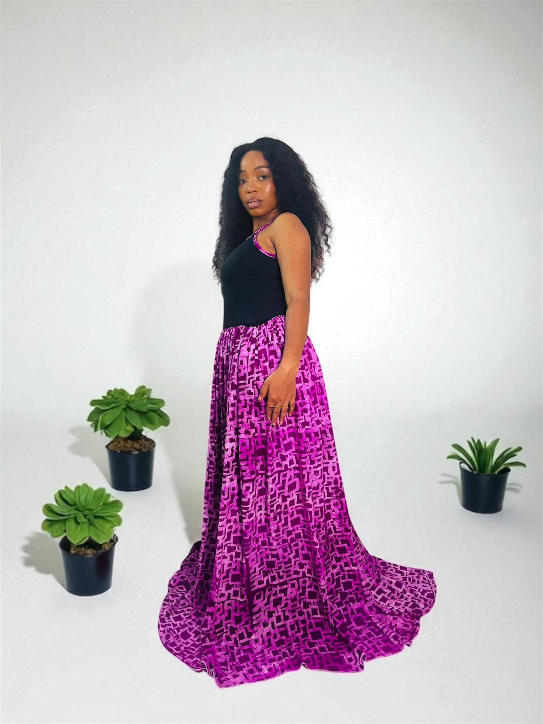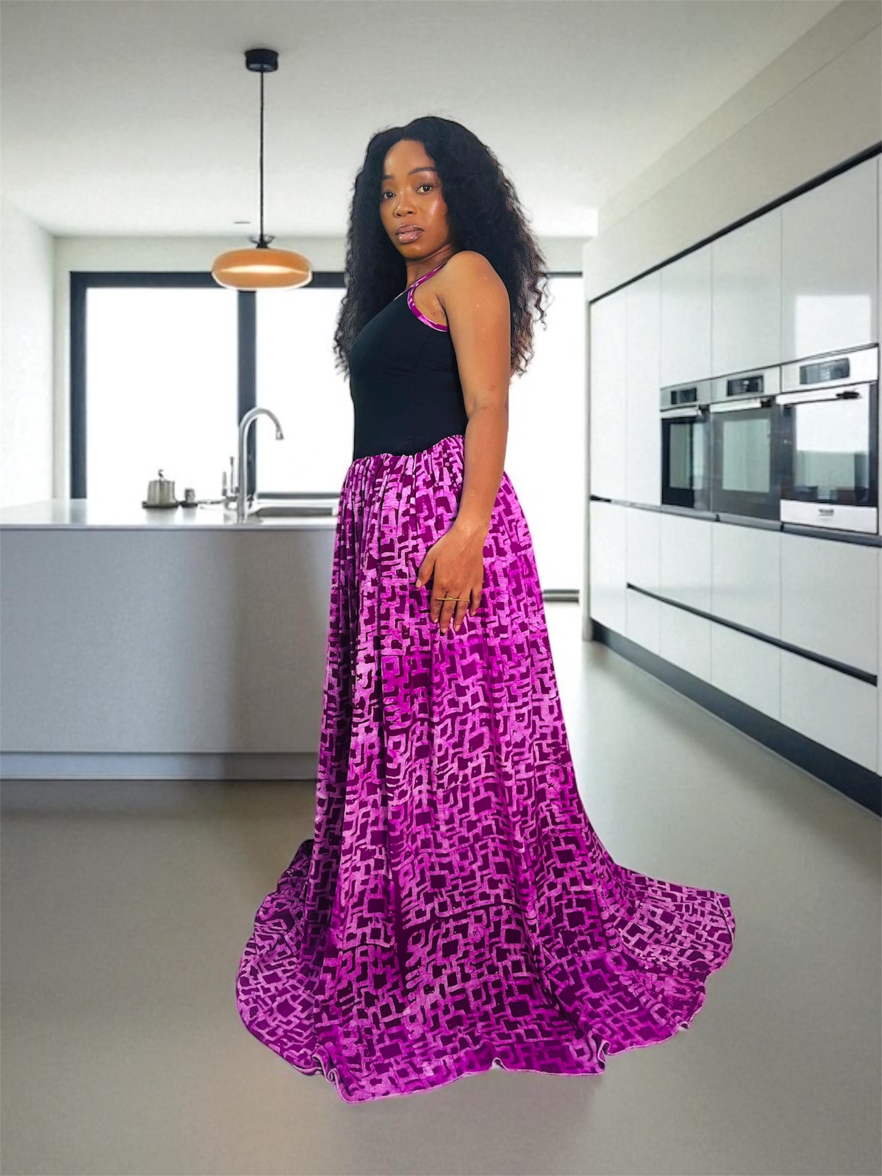 Découvrez la parfaite alliance du tissu adire artisanal et du stretch moderne dans cette robe longue à coupe ovale. Élégante et confortable, elle épouse délicatement les courbes tout en offrant une fluidité naturelle et un tombé raffiné.