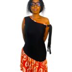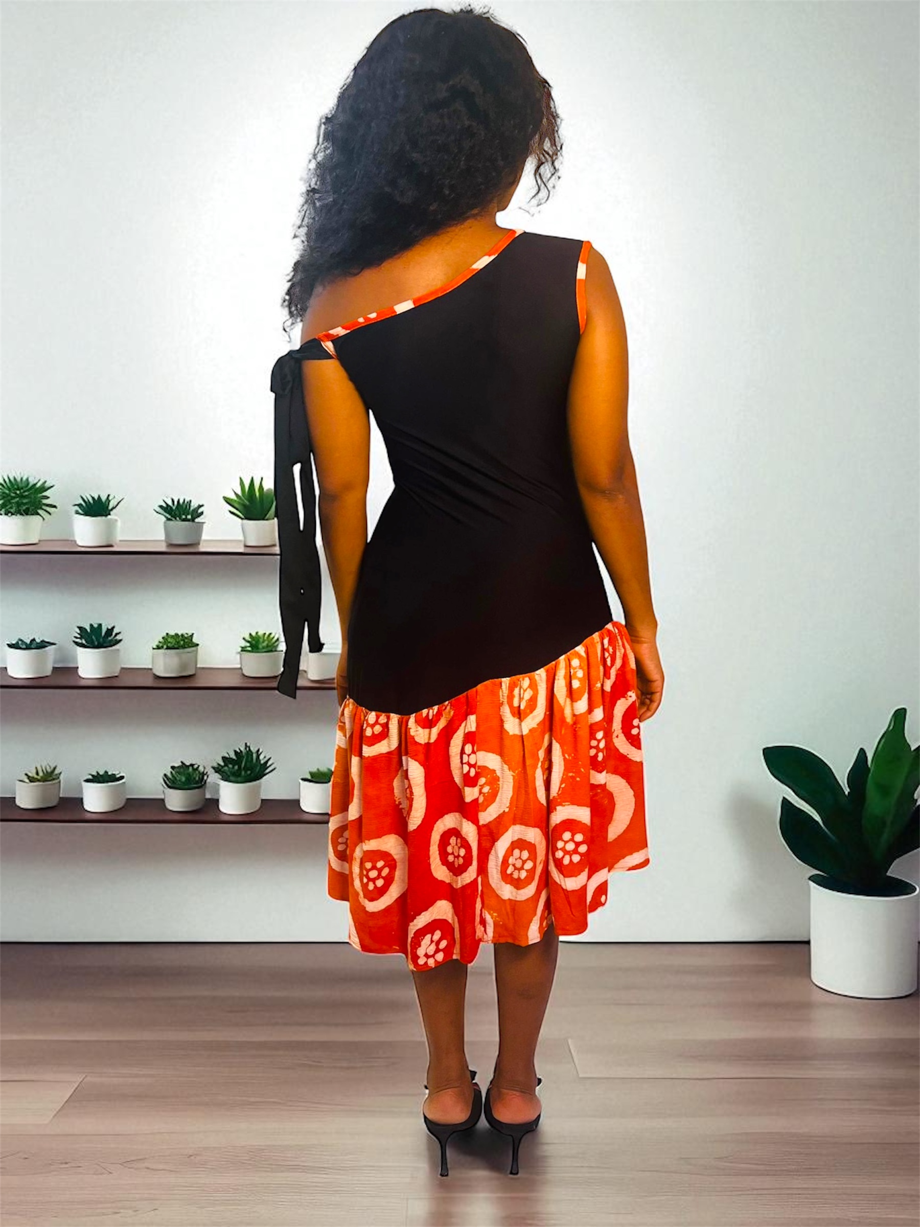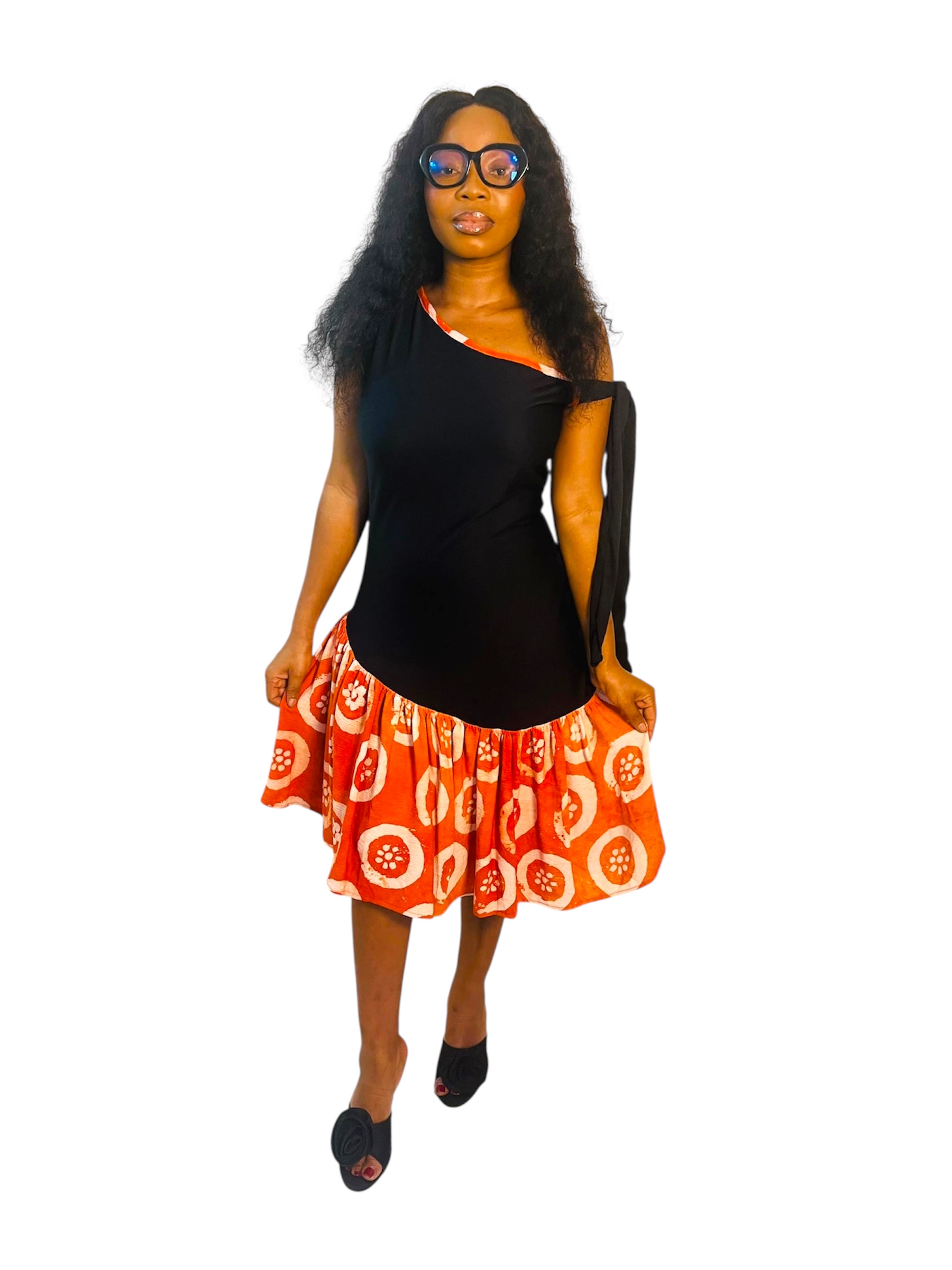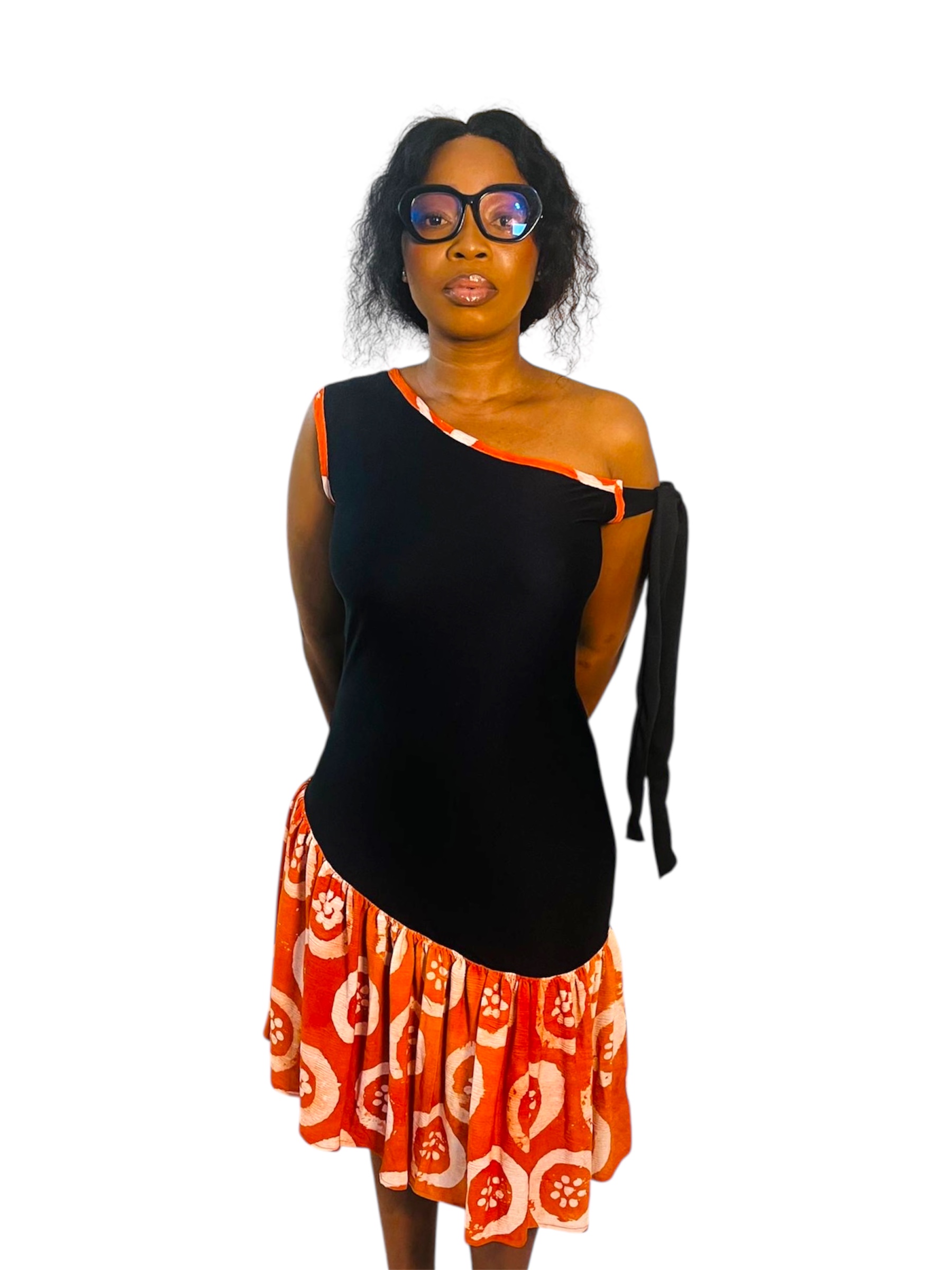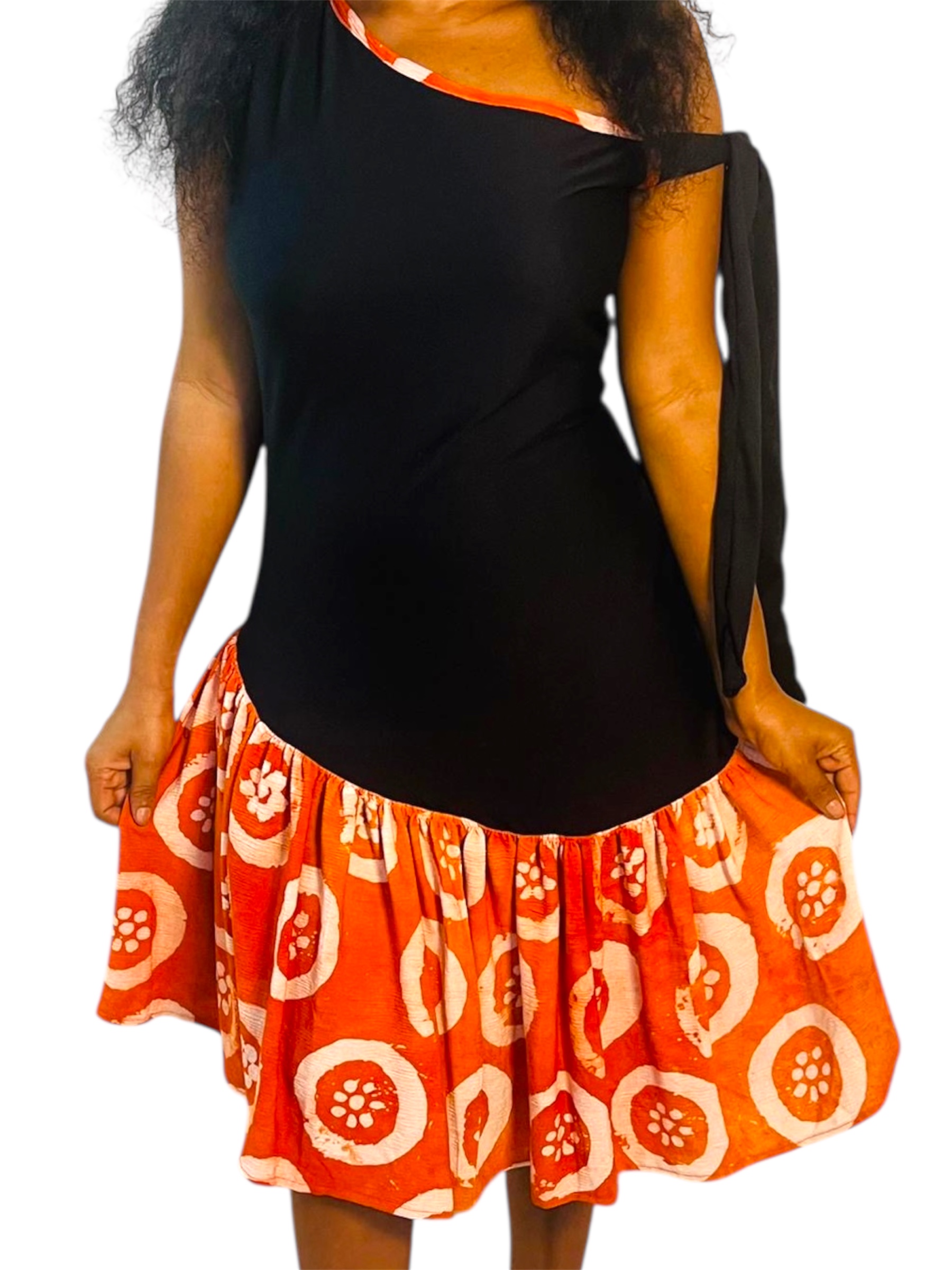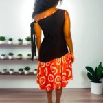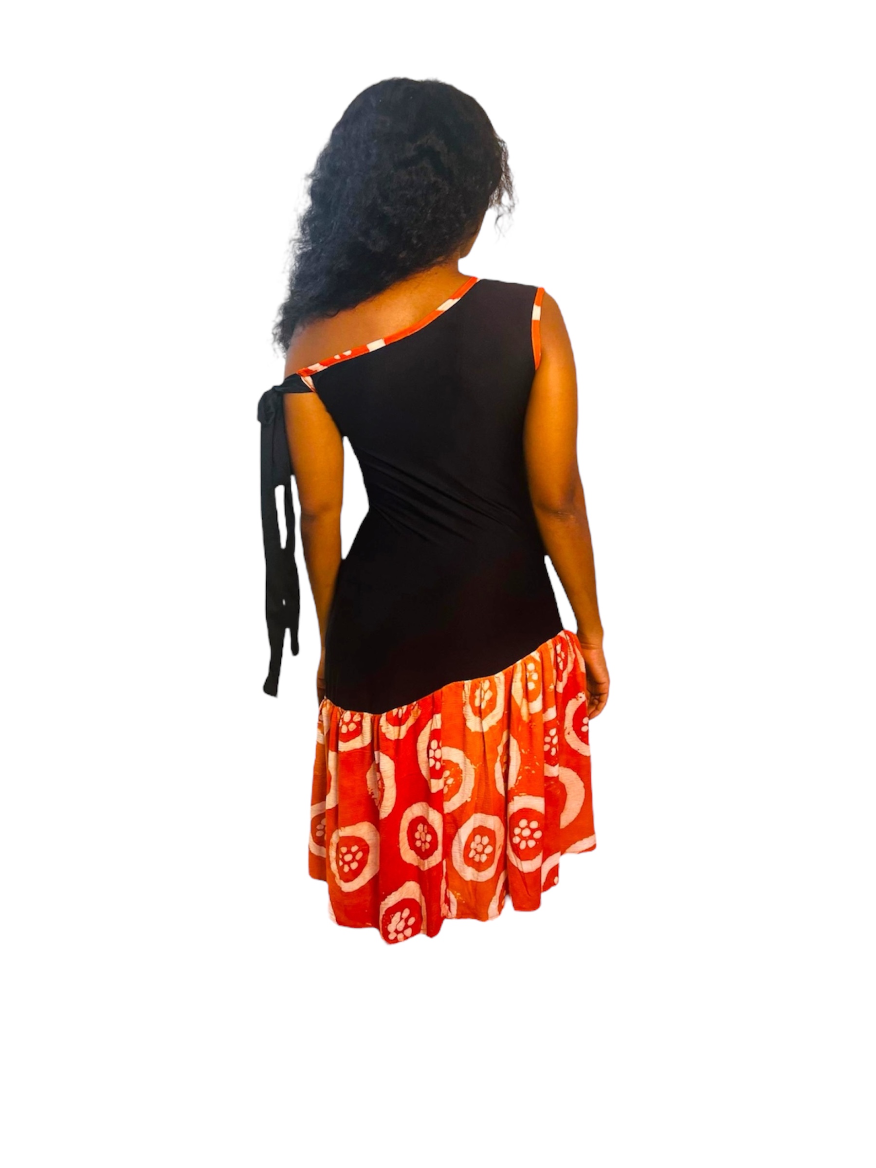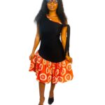 Osez l’élégance avec cette robe mini asymétrique, mélange raffiné de tissu adire artisanal et de crêpe fluide. L’association de ces deux matières crée un jeu de textures unique qui met en valeur la silhouette avec modernité et authenticité.